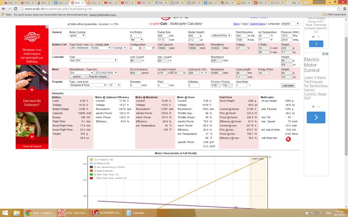 the battery i plan to use weighs 800g and it is 10000mAh 4S1P… I tested my combination using ecalc.ch tool, and in the attached image you can see the results… According, to ecalc it seems that there is no problem… I mean the speed is quite fast, and the flight times good…