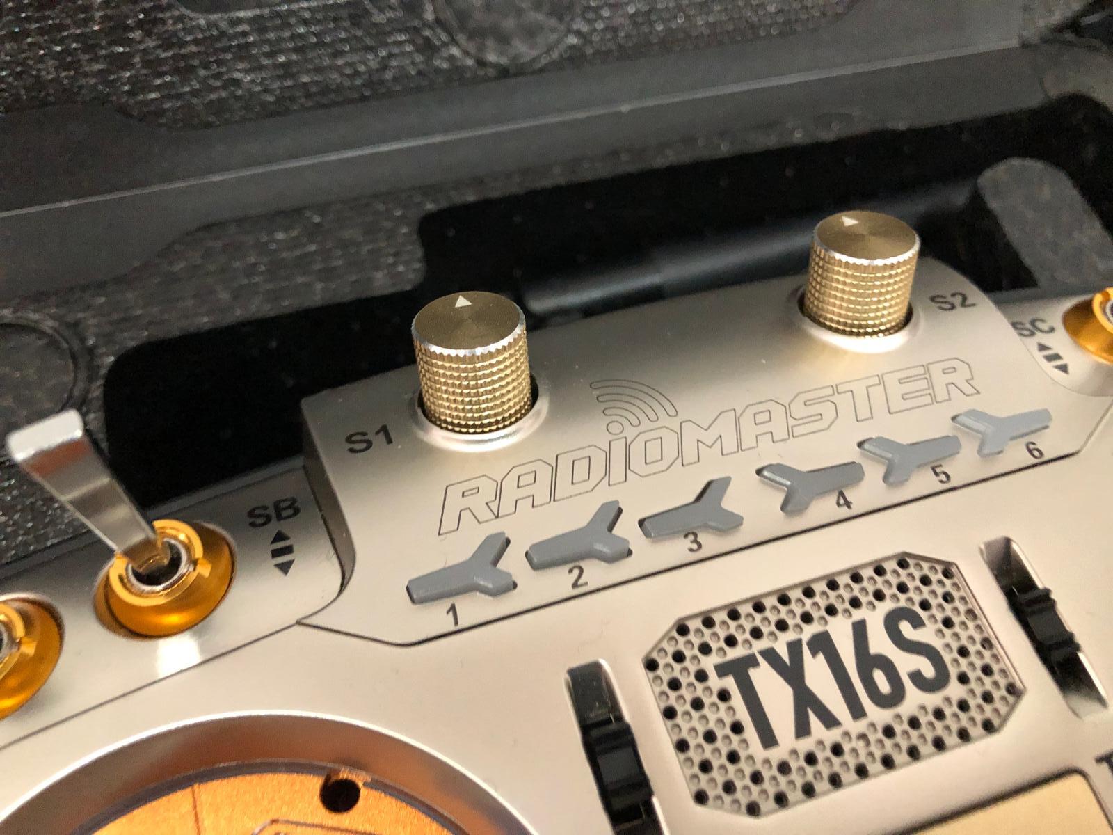 The TX16S MAX, has either black or red S1 or S2 knobs depending on which colour variant you select: