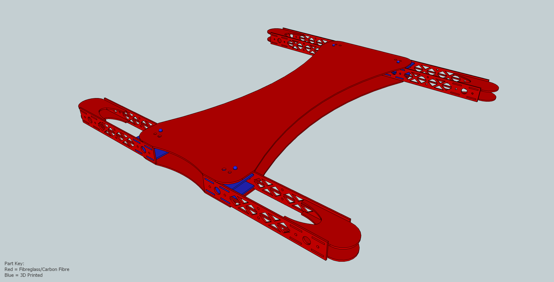 The initial prototype will be from fiberglass flat sheets. Depending on how well it works I am considering aluminum. The first quadcopter I ever saw many years ago was a custom build from alu, with it being anodized it looked great! That said I am concerned about weight if made in metal. Not to mention the company I have found that sells the fiberglass sheets can do tons of colours too. A friend of mine suggested selling it if it works. Dunno about that but keeping the thought open!