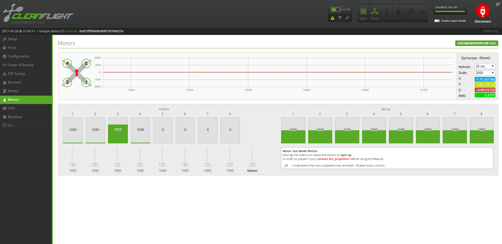 Connect LiPo battery again and you should now be OK with all motors running at the same speed.
