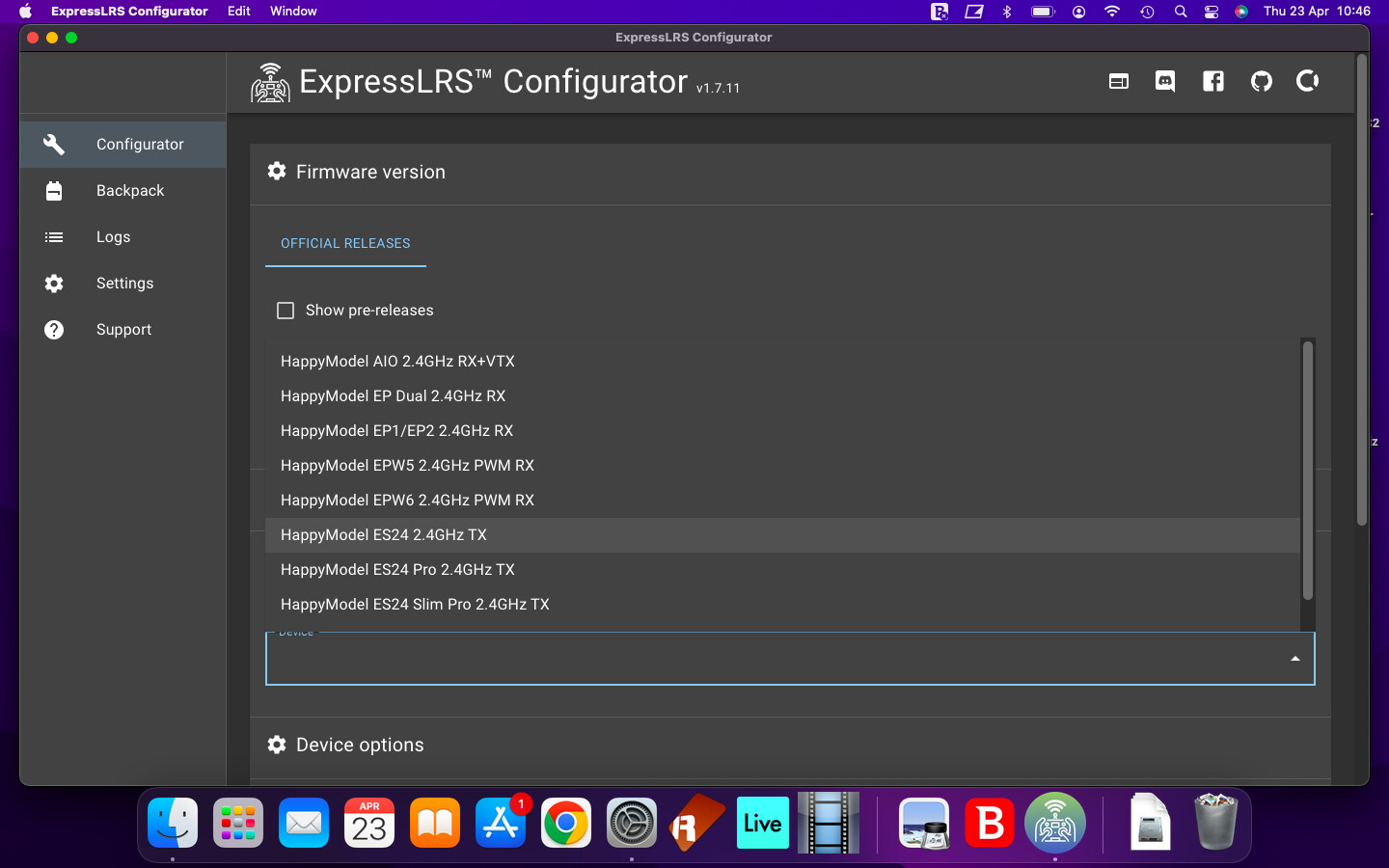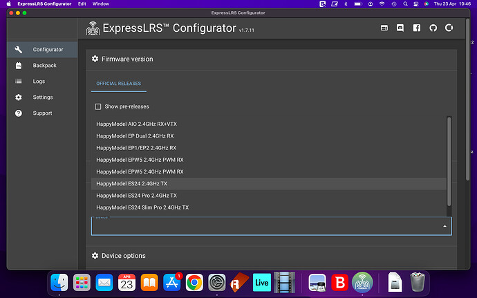 Thanks for sharing that screenshot — I can see you’ve pulled up the list of available firmware versions for the HappyDrone 2.4 RX in the ELRS Configurator. Good to know you’re already connected to the receiver via WiFi!
