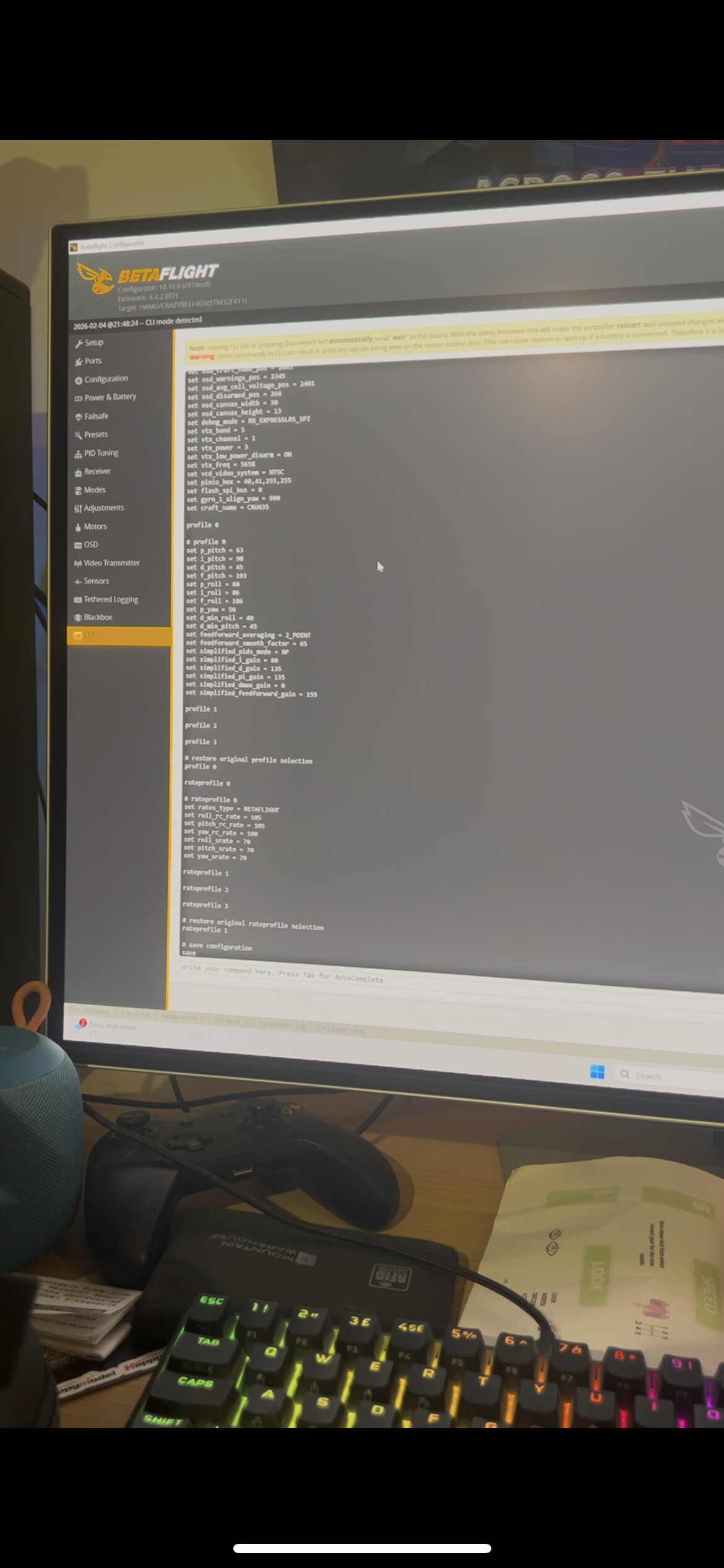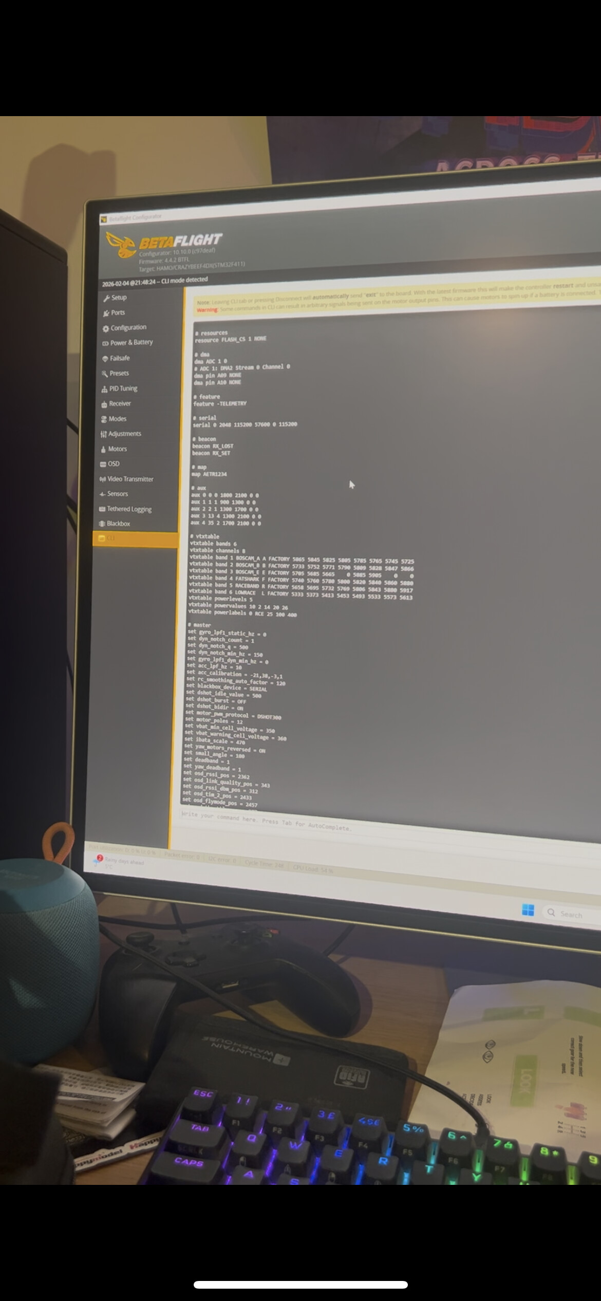 get vtx&diff all—share screenshots/output. OSD tab: Enable, add voltage/timer. - Voltage Test: Fresh 4S LiPo. Monitor VBAT in BF (>15V rest, >14V light throttle).